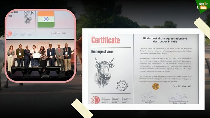 Rinderpest Virus बीते महीने भारत को वर्ल्ड लेवल पर एक बड़ी कामयाबी मिली है. हाल ही में पेरिस में हुए एक कार्यक्रम के तहत भारत को रिंडरपेस्ट वायरस ‘मवेशी प्लेग’ की रोकथाम के लिए बने एलीट ग्लोबल ग्रुप में शामिल किया गया है. इस मौके पर केन्द्रीय पशुपालन और डेयरी मंत्रालय की सचिव अलका उपाध्याय को सदस्यता का प्रमाण पत्र दिया गया. इस कार्यक्रम का आयोजन वलर्ड ऑर्गेनाइजेशन ऑफ एनिमल हैल्थ (WOAH) की 92वीं आम सभा के दौरान किया गया था. विश्व पशु स्वास्थ्य और जैव सुरक्षा के क्षेत्र में भारत को मिली ये एक बड़ी कामयाबी है.