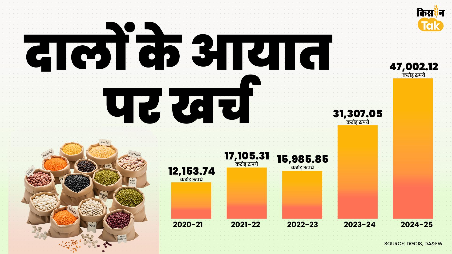 आत्मनिर्भरता के दावों के बीच भारत हर साल दालों के आयात का नया रिकॉर्ड बना रहा है. दलहन आयात लगभग 77 लाख मीट्रिक टन तक पहुंच गया है. हालात ये हैं कि पिछले पांच साल में ही भारत ने दालों के आयात पर लगभग सवा लाख करोड़ रुपये खर्च कर डाले हैं. लेकिन ताज्जुब की बात यह है कि दालों के बढ़ते आयात बिल के बावजूद भारत में दलहन फसलों की खेती बढ़ने की बजाय घट रही है. पिछले चार साल के दौरान ही दलहन फसलों के एरिया में लगभग 31 लाख हेक्टेयर की गिरावट दर्ज की गई है. आखिर ऐसा क्यों है? दलहन में आत्मनिर्भर भारत की बातें बहुत हो रही हैं, प्लान और पीपीटी बहुत बन रहे हैं, फिर भी क्यों इसकी खेती का दायरा सिकुड़ रहा है? इस सवाल का जवाब अधिकारी और सत्ताधारी नेता भले ही न दें, लेकिन इतना तो तय है कि जब तक किसानों को एमएसपी के स्तर तक या उससे अधिक दाम नहीं मिलेगा तब तक कोई भी मिशन सफल नहीं होगा.