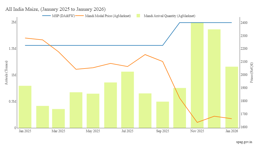 इस समय मक्के का एमएसपी 2400 रुपये प्रति क्विंटल है, जबकि जनवरी 2026 के दौरान देश में इसका औसत बाजार भाव 1663.23 रुपये प्रति क्विंटल रहा. केंद्रीय कृषि मंत्री शिवराज सिंह चौहान का गृह प्रदेश एमपी देश का सबसे बड़ा मक्का उत्पादक है. जनवरी में मध्य प्रदेश के सीहोर जिले में आने वाली रेहटी मंडी में मक्के का भाव 1486.4, शिवपुरी की खटोरा कृषि उपज मंडी में 1487.73 और विदिशा में 1496.35 रुपये प्रति क्विंटल रहा. जबकि सरकार खुद मानती है कि किसान प्रति क्विंटल मक्का पैदा करने में 1508 रुपये खर्च करता है. अब आप अंदाजा लगाईए कि किसानों को मक्के की खेती बढ़ाने का इनाम मिला या फिर धोखा.