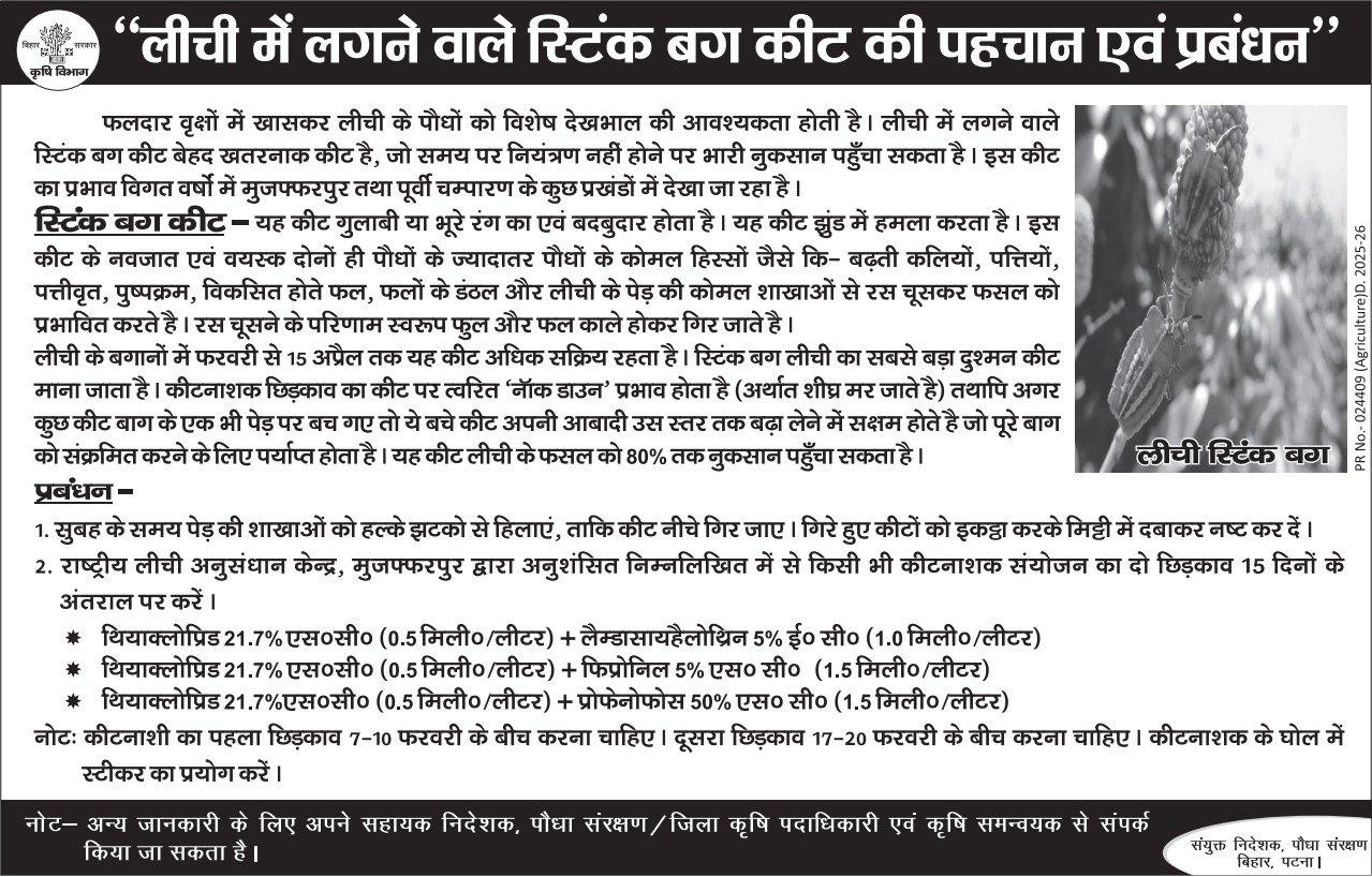 फरवरी और अप्रैल महीने की शुरुआत में फलदार वृक्षों में खासकर लीची के पौधों को विशेष देखभाल की जरूरत होती है. क्योंकि इस महीने लीची में लगने वाले स्टिंक बग कीट बेहद खतरनाक कीट है, जो समय पर नियंत्रण नहीं होने पर भारी नुकसान पहुंचा सकता है. इस कीट का प्रभाव पिछले कई वर्षों में लीची उत्पादन वाले खास जिला मुजफ्फरपुर और पूर्वी चम्पारण के कुछ प्रखंडों में देखा जा रहा है.