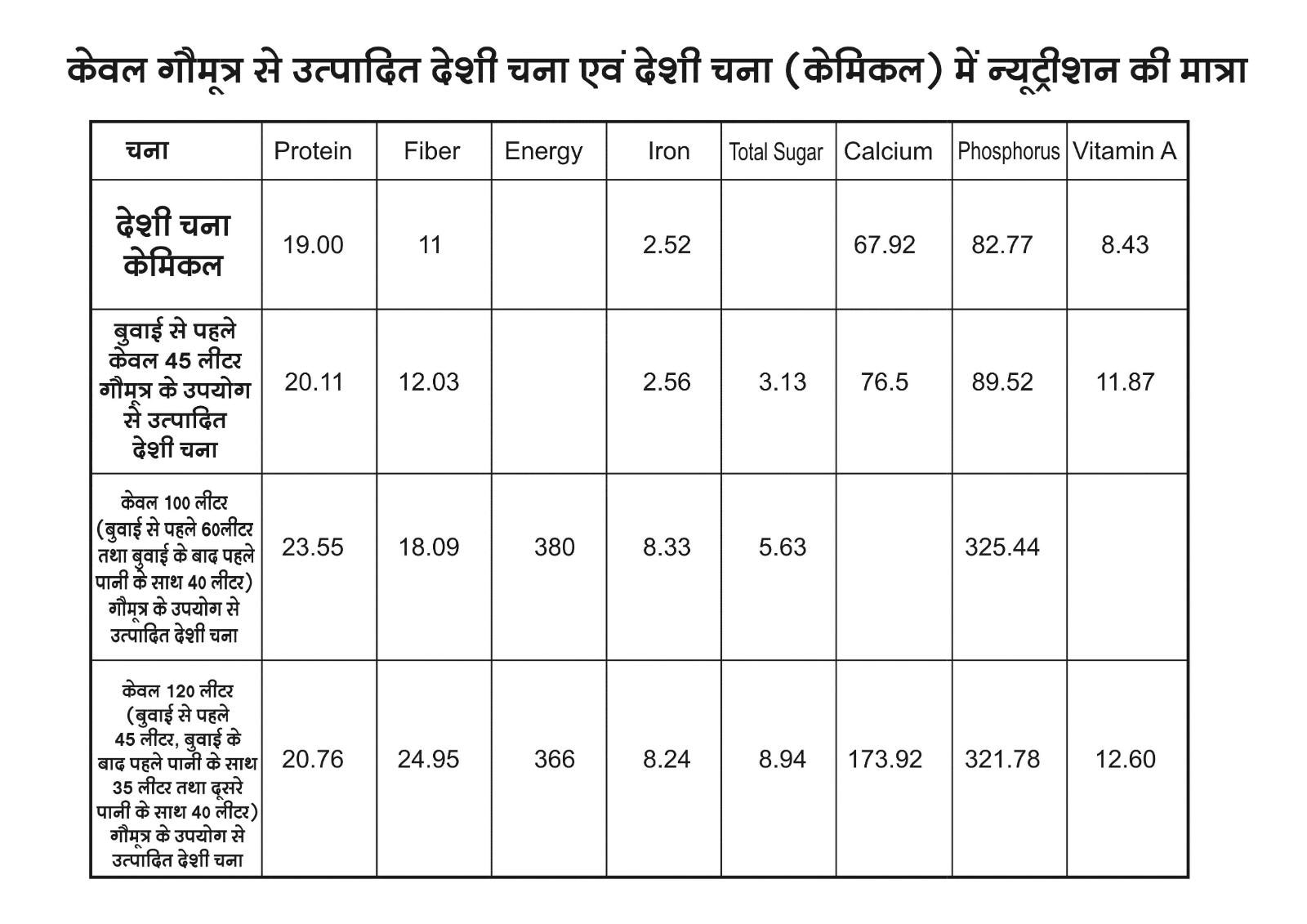 धर्मेंद्र नामदेव के प्रयोग का सबसे बड़ा असर चने की फसल में देखने को मिला।. पहले वे बिना गोमूत्र के खेती करते थे, जिससे उत्पादन तो अच्छा मिलता था लेकिन पोषक तत्व सीमित रहते थे. गोमूत्र के उपयोग के बाद उन्होंने अपनी फसल की जांच कराई, जिसमें हैरान करने वाले नतीजे सामने आए. पहले चने में प्रोटीन 19%, फाइबर 11%, आयरन 2.5%, कैल्शियम 68% और फास्फोरस 82% था. लेकिन गोमूत्र के उपयोग के बाद प्रोटीन बढ़कर 23.5%, फाइबर 18.9%, आयरन 8.3%, कैल्शियम 173.52% और फास्फोरस 325.41% तक पहुंच गया. यह नतीजे बताते हैं कि प्राकृतिक तरीकों से न सिर्फ उत्पादन, बल्कि फसल की गुणवत्ता भी बेहतर की जा सकती है.