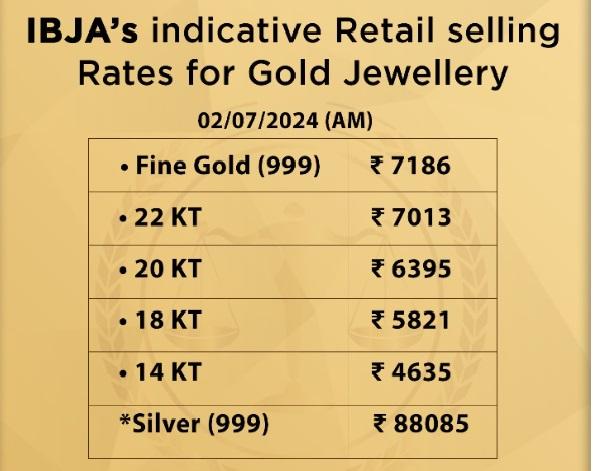 गोल्ड ज्वैलरी ट्रेड बॉडी IBJA इंडियन बुलियन एंड ज्वैलर्स एसोसिएशन ने आज 2 जुलाई 2024 के लिए दिल्ली में 24 कैरेट 22 कैरेट, 18 कैरेट, 14 कैरेट सोने और चांदी की अनुमानित रिटेल कीमतें जारी की हैं.