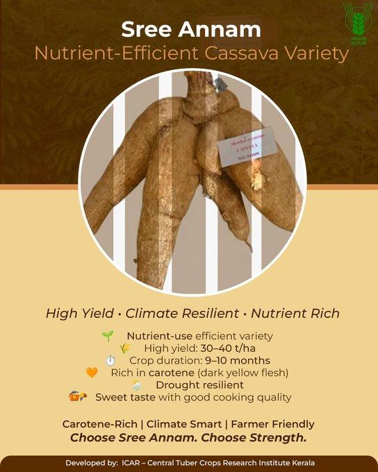 कसावा की खेती खेती में लगातार हो रहे बदलाव और मौसम की मार को देखते हुए कृषि क्षेत्र में कई नए काम किए जा रहे हैं. ऐसे में अब कृषि वैज्ञानिक भी खेती में अधिक उपज के लिए फसलों की नई किस्मों को तैयार कर रहे हैं, जो कम पानी, गर्मी पाला या अन्य चुनौतियों में भी अच्छा उत्पादन दे सकें. इसी दिशा में ICAR केंद्रीय कंद फसल अनुसंधान संस्थान, केरल ने शकरकंद की तरह दिखने वाले कसावा की एक नई और उन्नत किस्म को विकसित किया है. इस किस्म का नाम 'श्री अन्नम' है. ये किस्म न सिर्फ उच्च उपज देने वाली है, बल्कि जलवायु परिवर्तन के प्रभावों को झेलने में भी सक्षम है. ऐसे में आइए जानते हैं इसकी खासियत क्या-क्या है.