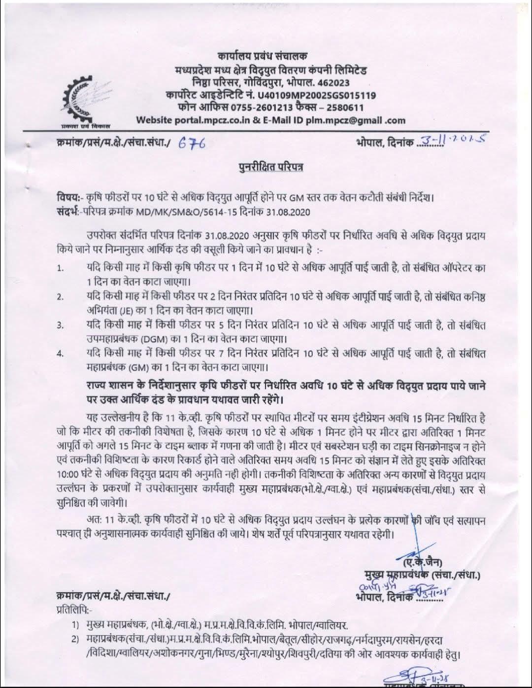 दरअसल, मध्य प्रदेश मध्य क्षेत्र विद्युत वितरण कंपनी लिमिटेड ने कृषि फीडरों पर 10 घंटे से अधिक बिजली सप्लाई होने पर अधिकारियों के वेतन में कटौती के निर्देश जारी किए हैं. कंपनी के महाप्रबंधक (संस्था/संस्था) की ओर से 3 नवंबर 2025 को जारी परिपत्र (क्रमांक 676) के अनुसार, यदि किसी कृषि फीडर पर निर्धारित अवधि से अधिक यानी 10 घंटे से अधिक बिजली आपूर्ति की जाती है, तो संबंधित अधिकारी — सहायक अभियंता (AE/AEEM), उपमहाप्रबंधक (DGM) और महाप्रबंधक (GM) — के वेतन से एक दिन का वेतन काटा जाएगा.