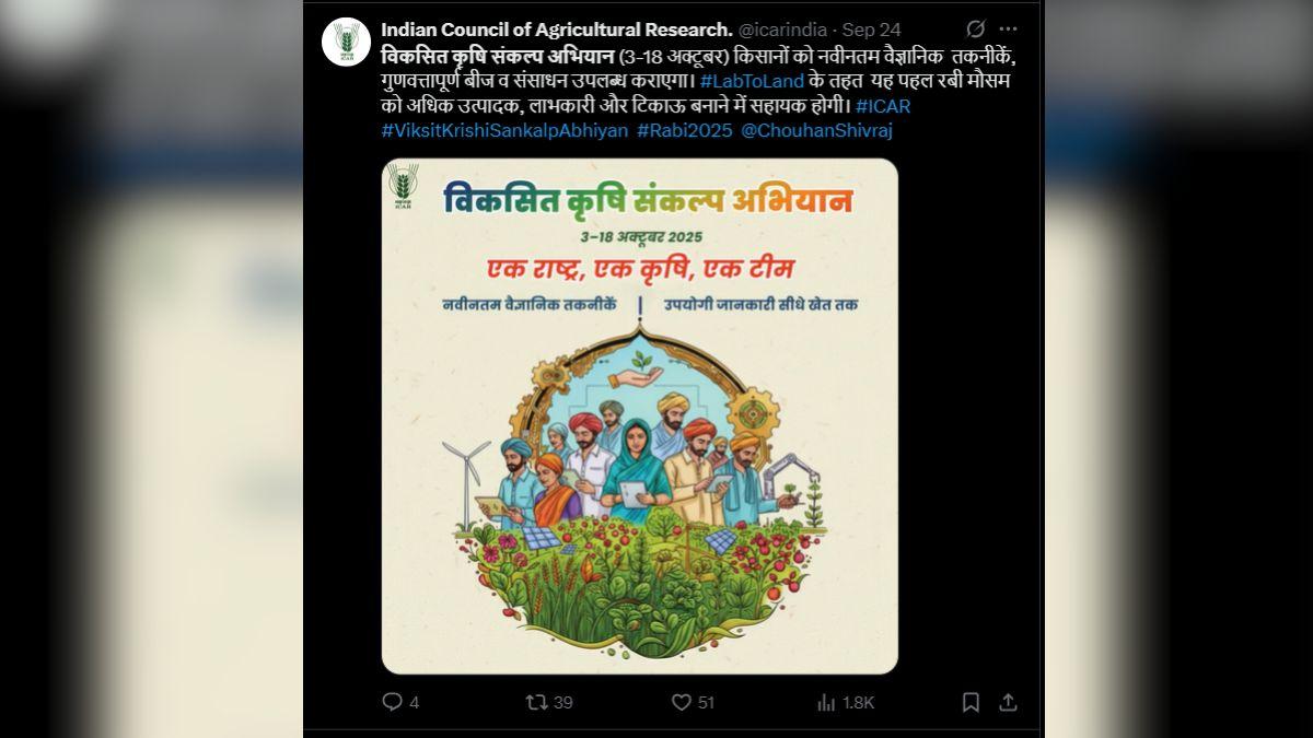 मालूम हो कि केंद्रीय कृषि मंत्री शिवराज सिंह चौहान ने खरीफ सीजन में 29 मई से 12 जून, 2025 तक पहली बार विकसित कृषि संकल्प अभियान चलाया था, जिसमें वैज्ञानिकों और किसानों के बीच सीधा संवाद हुआ था. लैब टू लैंड के कॉन्सेप्ट को आगे बढ़ाते हुए इस अभियान के तहत वैज्ञानिकों की 2170 टीमों ने 1.42 लाख से अधिक गांवों में 1.34 करोड़ से ज्यादा किसानों से किया सीधा संवाद किया था. उनकी समस्याओं को जाना और उस हिसाब से अपने रिसर्च का रोडमैप बनाने का संकल्प लिया था.