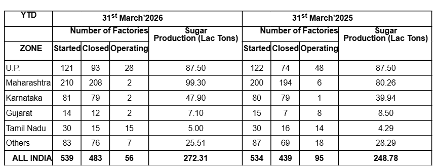 खास बात यह है कि दक्षिण कर्नाटक की कुछ मिलों के जून/जुलाई से सितंबर 2026 तक चलने वाले विशेष सीजन के दौरान फिर से चालू होने की उम्मीद है. इसके अलावा, तमिलनाडु की कुछ मिलें भी इस विशेष सीजन में अपना काम जारी रखेंगी. नीचे दी गई तालिका में इस साल और पिछले साल के चीनी उत्पादन का राज्यवार ब्योरा दिया गया है: