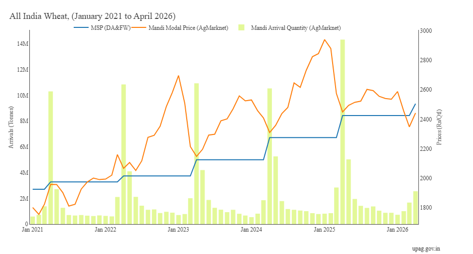 केंद्रीय कृषि मंत्रालय के आंकड़ों पर गौर करें तो नवंबर 2021 में गेहूं का एमएसपी 1975 रुपये प्रति क्विंटल था, जबकि मंडियों में किसानों को 2000.76 रुपये का भाव मिल रहा था. यह सिलसिला जनवरी 2025 तक अपने चरम पर पहुंचा, जब एमएसपी 2275 रुपये था, लेकिन बाजार में गेहूं 2939.69 रुपये प्रति क्विंटल के भाव पर बिक रहा था. हालांकि, मार्च 2026 आते-आते तस्वीर पूरी तरह बदल गई. मार्च में गेहूं की एमएसपी 2425 रुपये थी, लेकिन मंडियों में भाव गिरकर 2367.25 रुपये प्रति क्विंटल रह गया था. वहीं, वर्तमान में गेहूं का एमएसपी 2,585 रुपये प्रति क्विंटल है, जबकि खुले बाजार में दाम 2441.88 रुपये प्रति क्विंटल चल रहा है.