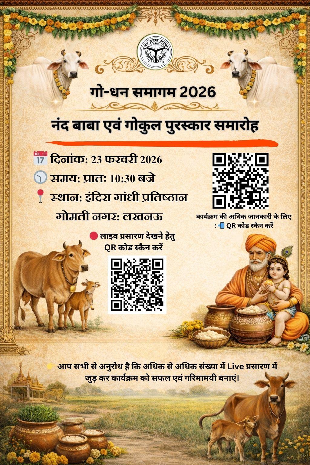 उत्तर प्रदेश की राजधानी लखनऊ के गोमती नगर स्थित इन्दिरा गांधी प्रतिष्ठान में 23 फरवरी यानी आज 'गोधन समागम-2026' का भव्य आयोजन होने जा रहा है. पशुधन एवं दुग्ध विकास विभाग के कैबिनेट मंत्री धर्मपाल सिंह सुबह 10:30 बजे इस कार्यक्रम का शुभारंभ करेंगे. इस आयोजन का मुख्य उद्देश्य प्रदेश में गौ-वंश के संरक्षण और दुग्ध उत्पादन को बढ़ावा देने वाले कर्मठ लोगों को प्रोत्साहित करना है. कार्यक्रम के दौरान वर्ष 2024-25 के लिए कुल 63 'गोकुल पुरस्कार' और 49 'नन्द बाबा पुरस्कार' प्रदान किए जाएंगे.