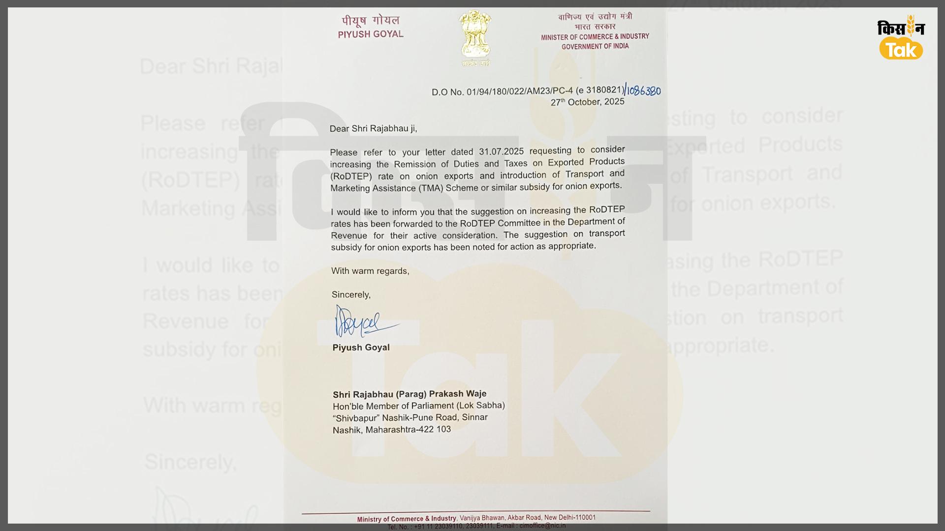 बहरहाल, सांसद के पत्र लिखने के तीन महीने बाद सरकार को अब होश आया है, जब किसानों को काफी नुकसान हो चुका है. केंद्रीय वाणिज्य मंत्री पीयूष गोयल ने 27 अक्टूबर को भेजे अपने जवाब में बताया कि सांसद वाजे की सिफारिशें वित्त मंत्रालय के राजस्व विभाग में गठित RoDTEP (Remission of Duties and Taxes on Exported Products) समिति को विचार करने के लिए भेज दी गई हैं.