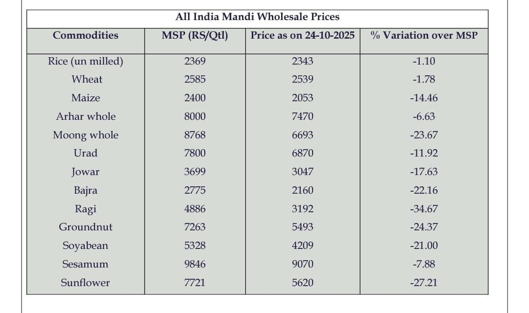 सरकारी आंकड़ों पर अगर यकीन करें तो ज्यादातर प्रमुख खरीफ और रबी फसलों की थोक कीमतें न्यूनतम समर्थन मूल्य यानी एमएसपी से से नीचे लुढ़क चुकी हैं. स्थिति यह है कि किसानों को अब अपनी उपज पर मुनाफा भी नहीं मिल रहा है और एमएसपी तक भी हासिल नहीं हो पा रही है. 24 अक्टूबर 2025 तक के आंकड़ों के अनुसार, मक्का, सोयाबीन, सूरजमुखी और मूंग जैसी प्रमुख फसलों के भाव एमएसपी से 15 से 27 फीसदी तक नीचे चल रहे हैं.