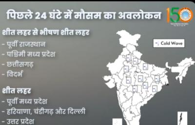 भारतीय मौसम विज्ञान विभाग (IMD) ने आज मध्य प्रदेश के कुछ स्थानों पर भीषण शीत लहर का ऑरेंज अलर्ट जारी किया है. छत्तीसगढ़, पूर्वी राजस्थान, मध्य महाराष्ट्र, मराठवाड़ा, तेलंगाना और उत्तर-पश्चिम भारत में भी ऐसी ही स्थिति रहेगी. मौसम विभाग ने अगले दो दिनों तक आंध्र प्रदेश, केरल, माहे, तमिलनाडु, पुडुचेरी और कराईकल में भारी बारिश की भविष्यवाणी की है.