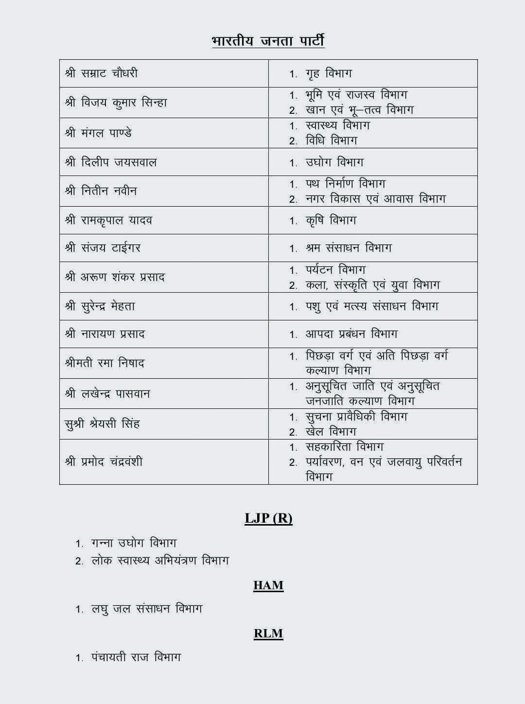 बिहार में मंत्री पद का बंटवारा हो गया है. रामकृपाल यादव कृषि मंत्री बनाए गए हैं. नितिन नवीन को पत्र निर्माण विभाग के साथ-साथ नगर विकास एवं आवास विभाग मिला है. संजय टाइगर को श्रम संसाधन विभाग का मंत्री बनाया गया है. अरुण शंकर प्रसाद को पर्यटन विभाग के साथ-साथ कला संस्कृति एवं युवा विभाग की जिम्मेदारी दी गई है. सुरेंद्र मेहता को पशु एवं मत्स्य संसाधन विभाग दिया गया है. रमा निषाद को पिछड़ा वर्ग एवं अति पिछड़ा वर्ग कल्याण विभाग दिया गया है.