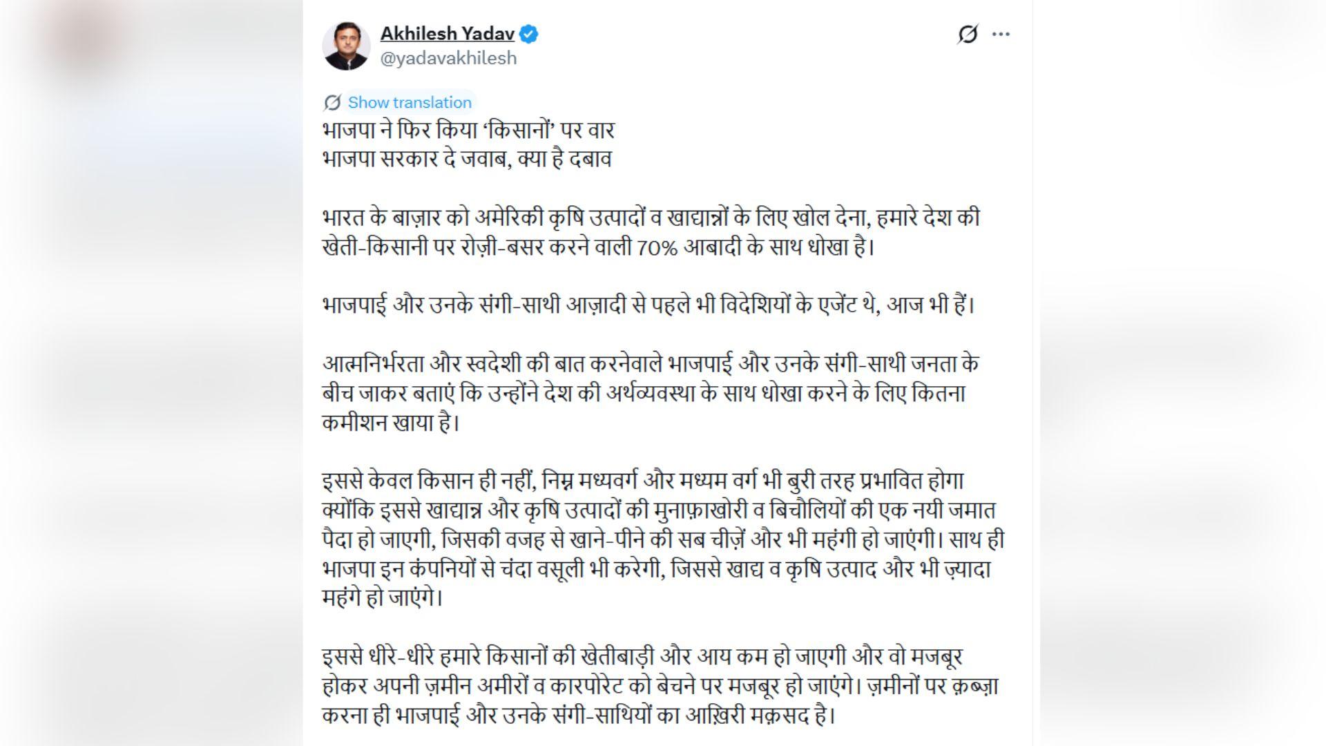अखिलेश यादव ने सवाल उठाया कि आखिर किस दबाव में सरकार ने यह फैसला लिया है? इसका सीधा नुकसान छोटे और मझोले किसानों को झेलना पड़ेगा. अखिलेश यादव ने यह भी आरोप लगाया कि इस तरह की नीतियों से केवल किसानों की आमदनी पर ही नहीं, बल्कि देश के निम्न मध्यम वर्ग और मध्यम वर्ग पर भी असर पड़ेगा.