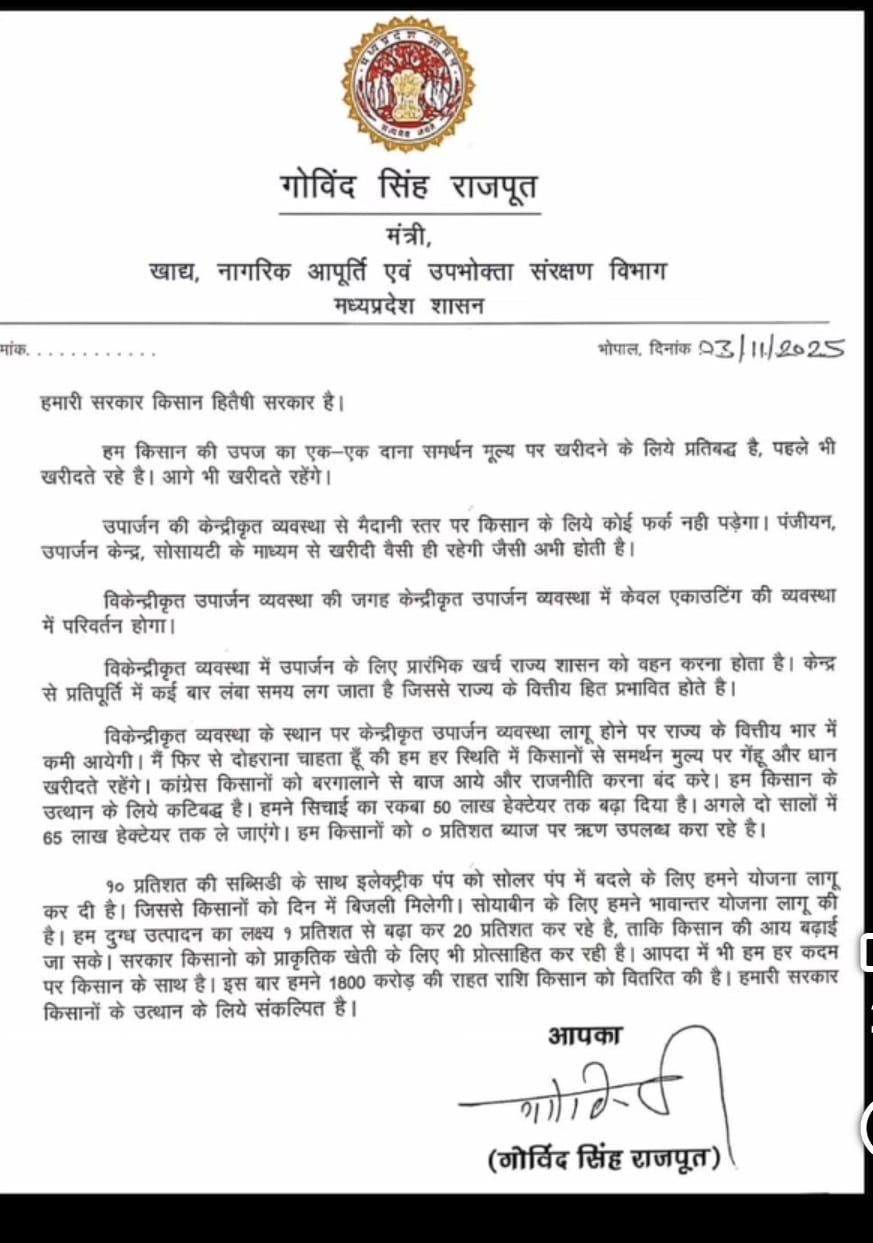 इस विवाद पर प्रदेश के खाद्य मंत्री गोविंद सिंह राजपूत ने मोर्चा संभाला और एक पत्र जारी कर सफाई दी. उन्होंने कहा कि राज्य सरकार किसानों की उपज का एक-एक दाना एमएसपी पर खरीदेगी.